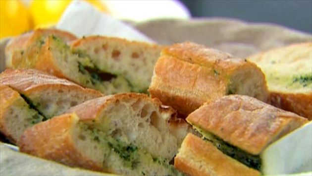 - Generously butter the cut insides of each baguette and toast on the griddle over moderate heat until lightly browned - 1 to 2 minutes.