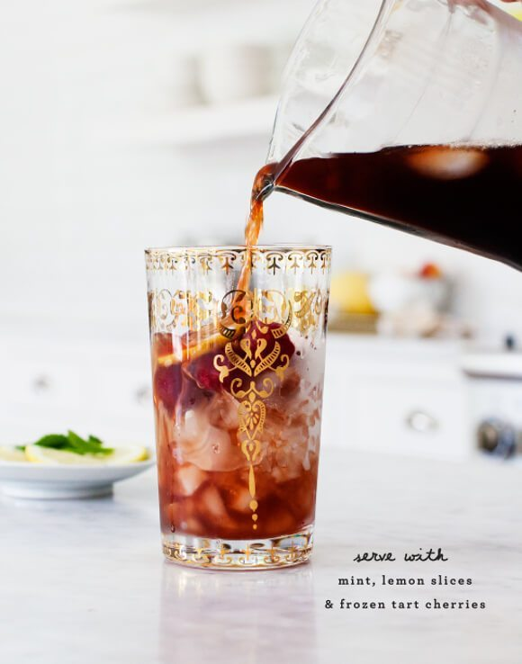 - Once cool, add tea to a container. Add cherry juice, lemon slices, and mint.